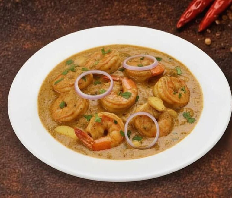 GAMBAS GRILLÉES AUX ÉPICES, NOIX DE COCO, CAJOU, RAISINS ET CRÈME FRAÎCHE.
